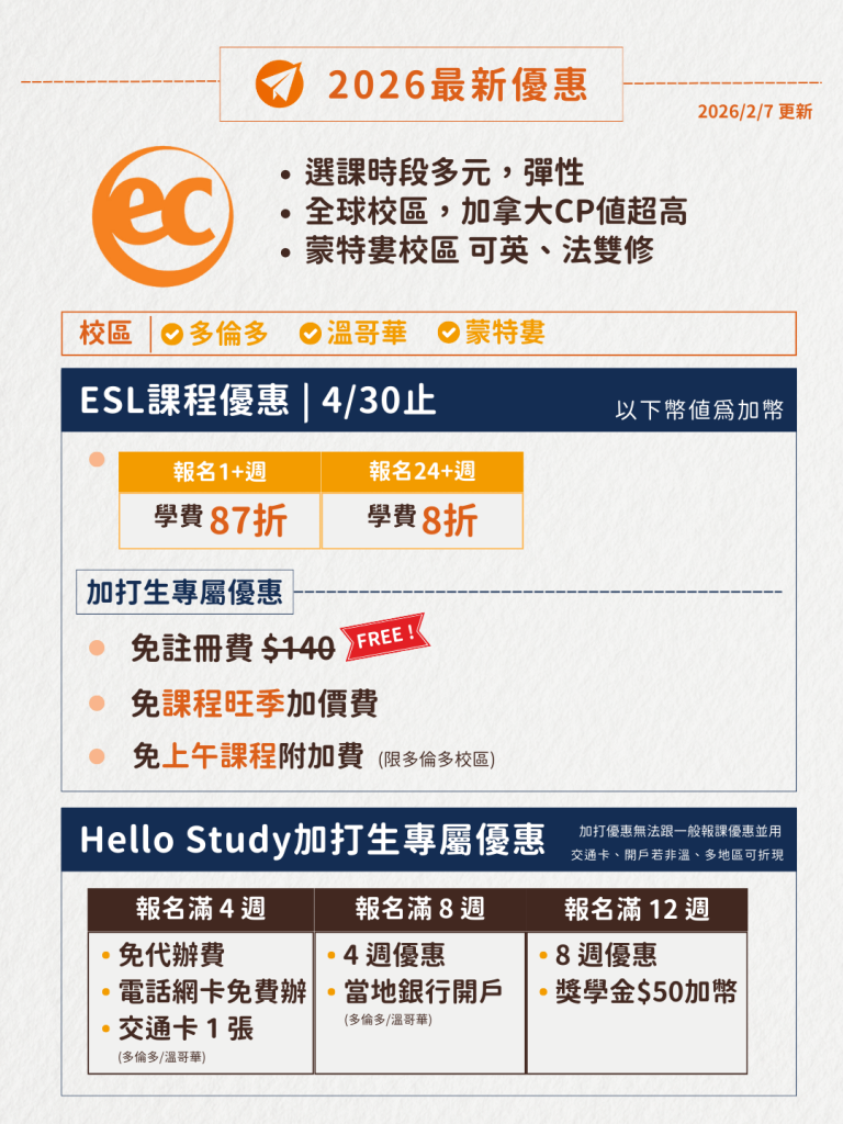 EC加打優惠:符合資格者(視報名週數)可學費減免優惠。