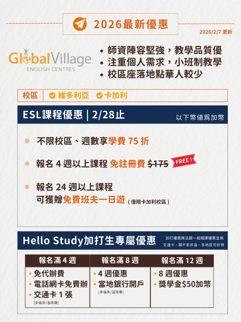 Global Village加打優惠:學生可享免註冊費和學費減免優惠。