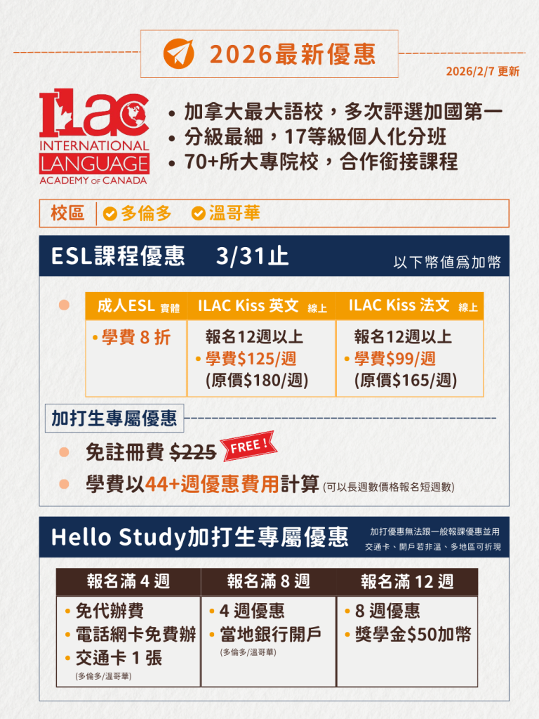 - ILSC加打優惠:符合資格可享贈送課程、學費折抵和課程學費折扣等優惠