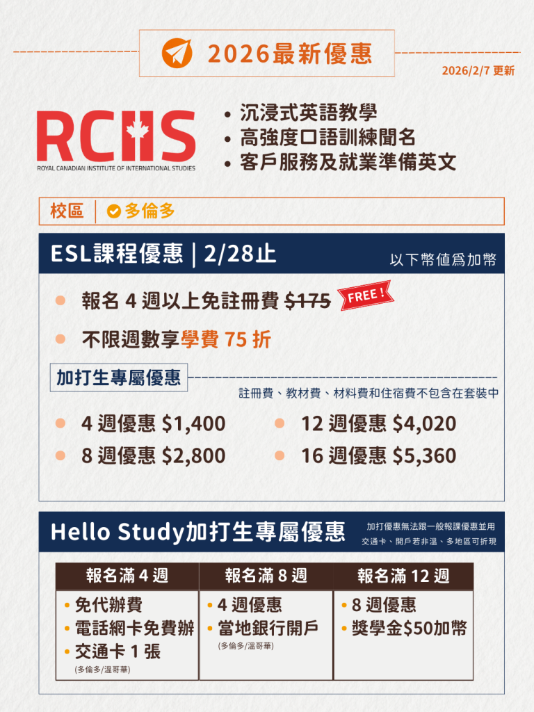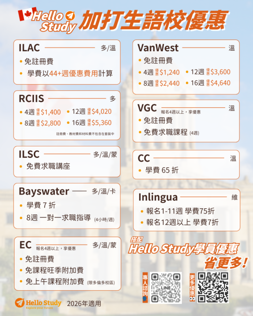 學校其餘優惠詳洽Hello Study顧問,以上優惠至2025/1/24止,如有更動依當下公告為準。
