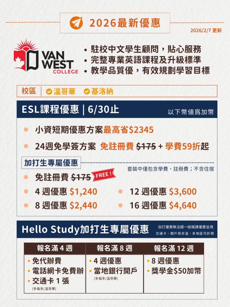 Vanwest加打優惠:學生可享免註冊費、學費優惠和贈送課程等優惠