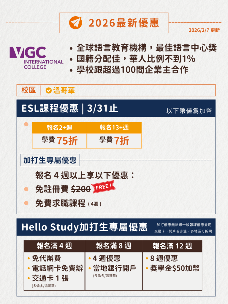 VGC加打優惠:報名課程者可享贈送語言課程&求職課程優惠