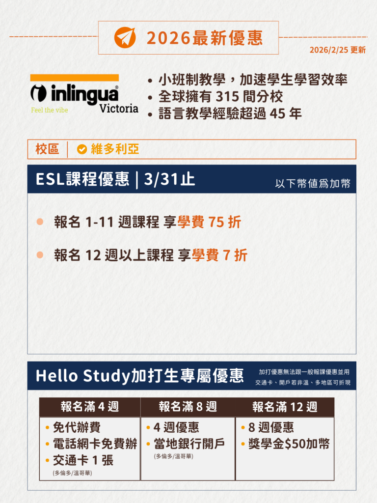 - Inlingua加打優惠:學生註冊 1-11 週可享課程75折;註冊 12 週以上可享課程7折