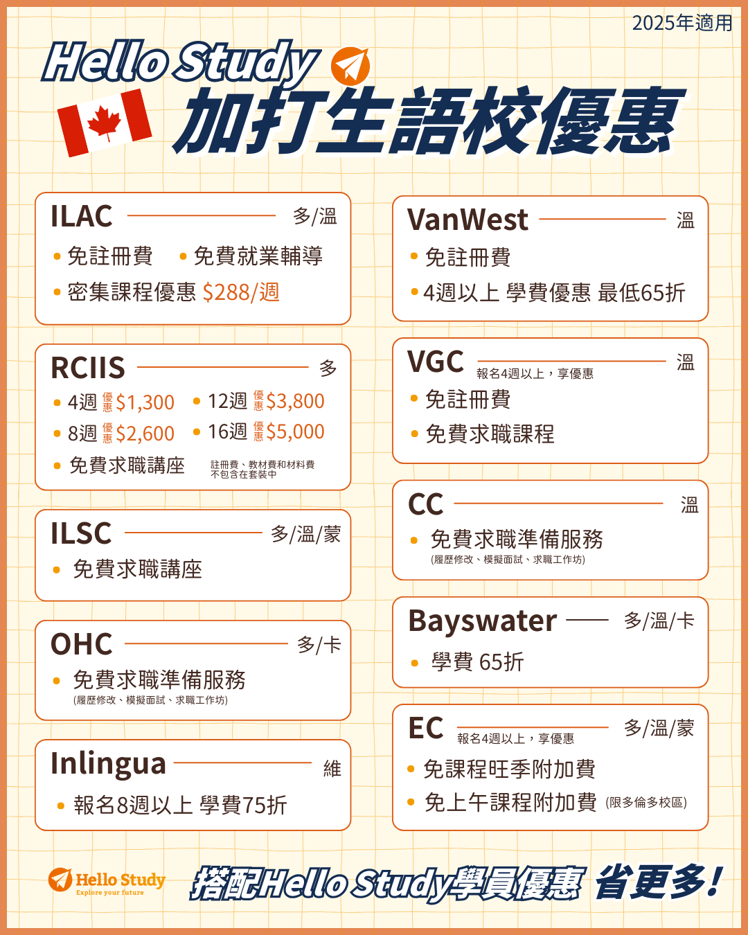 學校其餘優惠詳洽Hello Study顧問,以上優惠至2025/1/24止,如有更動依當下公告為準。