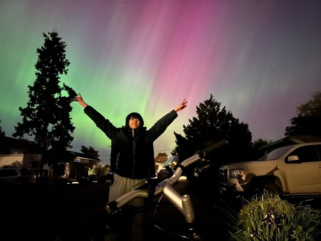 曲棍球賽、耶誕與畢業舞會等。這些活動讓我第一次用生活認識加拿大,而不只是透過課本想像。站在雪山上滑雪,泡泡麵玩懸空湯匙、筷子和麵條,或是戶外泡湯玩熱水秒變冰粉的遊戲、近距離看鯨魚躍出海面,甚至在 homestay 家門口看到好幾次極光,這些回憶是我留學生活中最珍貴的一部分。